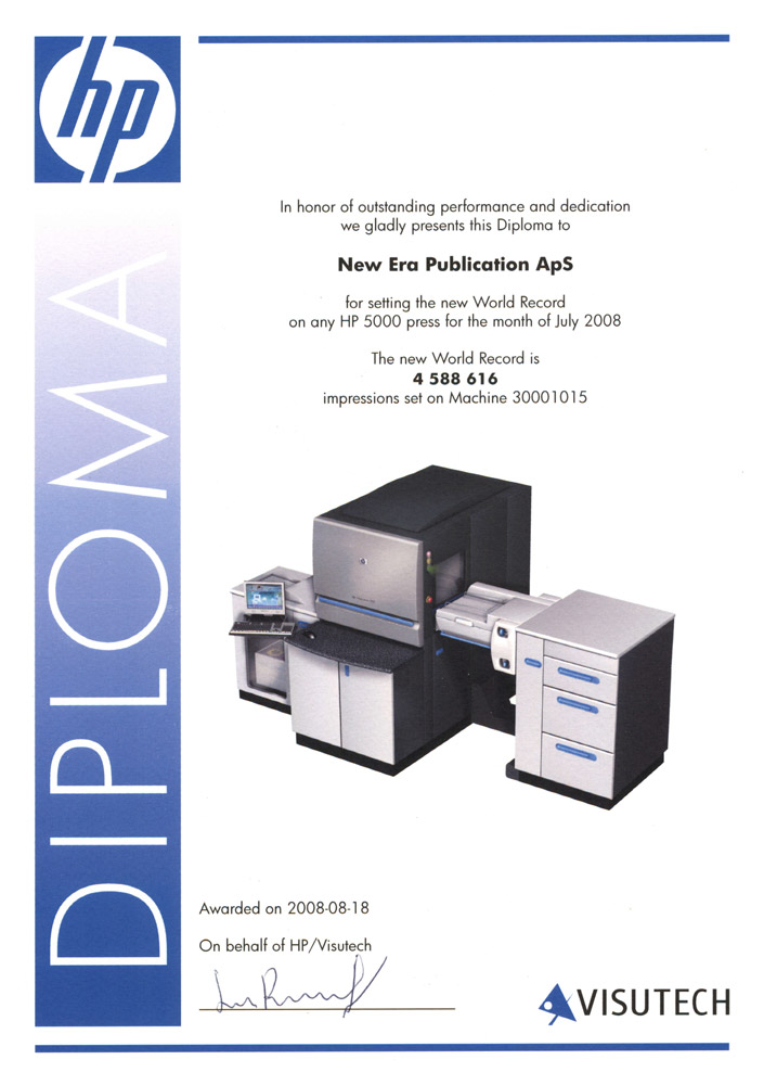Hewlett Packard, ook bekend als HP, is een Amerikaanse multinational, opgericht in 1939 en een van de grootste aanbieders van IT-apparatuur en IT-toepassingen. HP specialiseert zich in het ontwikkelen en produceren van digitale hardware, inclusief een breed assortiment aan digitale printers en imaging producten. Het aantal afdrukken dat HP machines wereldwijd maken, wordt centraal bijgehouden. Klanten die wereldrecords behalen worden door Hewlett Packard en zijn distributeur, Visutech, onderscheiden met een oorkonde.