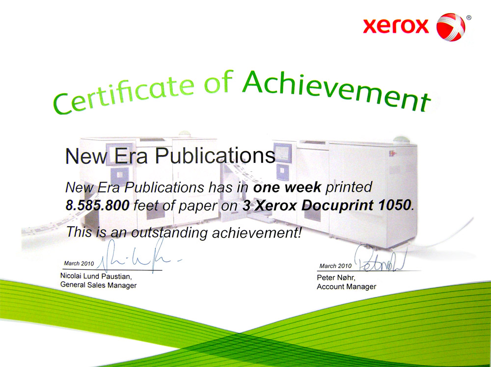 Xerox werd opgericht in 1906 in Rochester, New York, en hoort tot de 500 grootste ondernemingen van de wereld. Het fabriceert een breed scala aan digitale drukpersen. New Era Publications gebruikt de Xerox Docuprint 1050 Rotatieve Printer met invoerrolpapier voor de zwart en wit afdrukken. Xerox onderscheidt zijn grote klanten met een Certificaat van Verdienste als er een mijlpaal wordt bereikt met Xerox apparatuur.